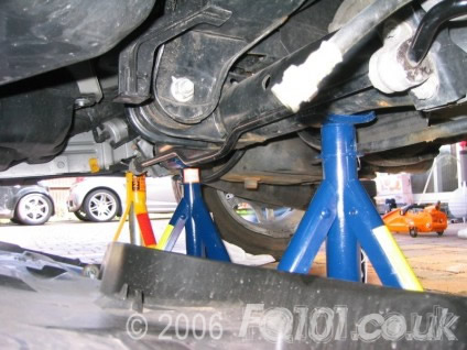Now jack up the car, and mount some axle stands under the engine sub-frame, AND under the Tridion jacking points.