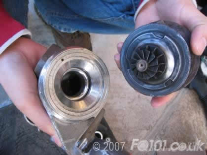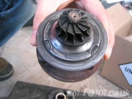 Take the opportunity to check the blades for signs of pitting; the turbine wheel should be okay, but pay close attention to the compressor wheel.