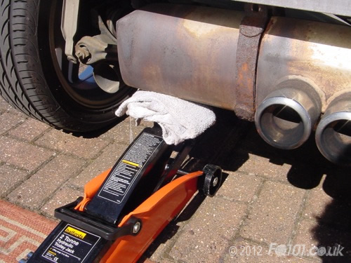 Support the end of the exhaust so that it doesn't drop when the strap is freed. Equally, do not force the exahust upwards. In this case, we have used a jack to provide light support.