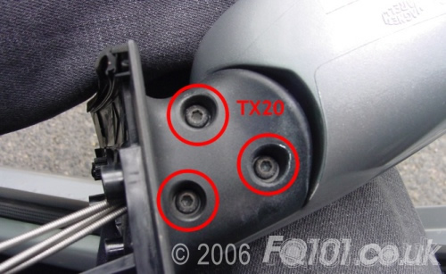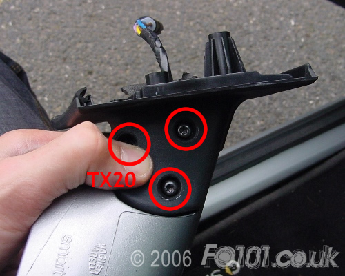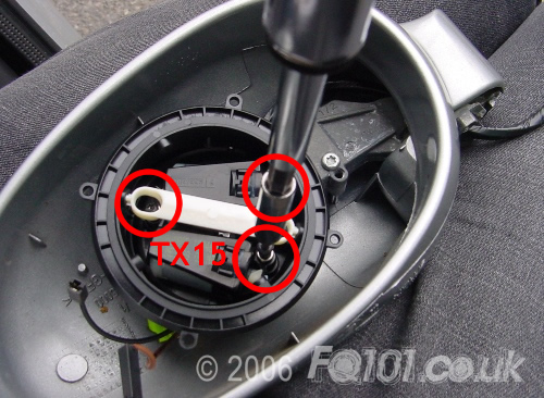 Remove the mirror direction mechanism by undoing the 3x TX15 screws holding it in place.