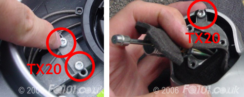Replace the supporting frames first with the silver TX20 screws. Then fix the electric wing mirror motors where the manual ones were. Feed the cable through the mirror and out underneath.