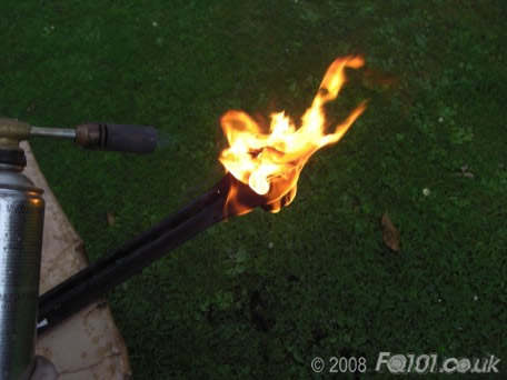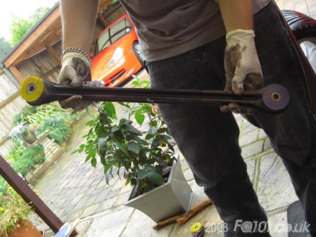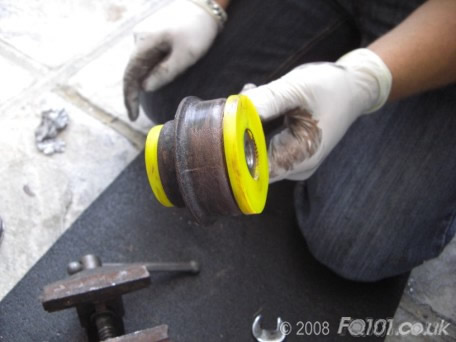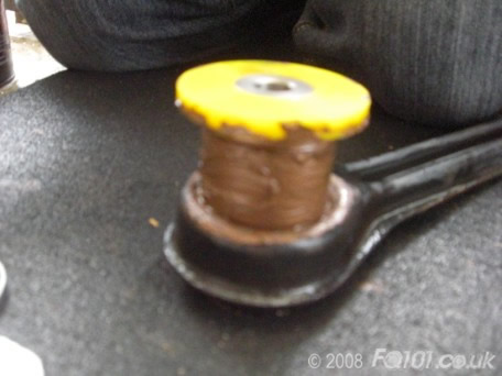 Using a blow torch, burn the old bushes out of the arms. The outer frame from the old bush needs to be retained as this will be the seat for the new bush.