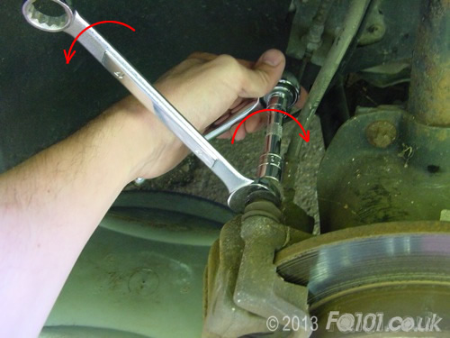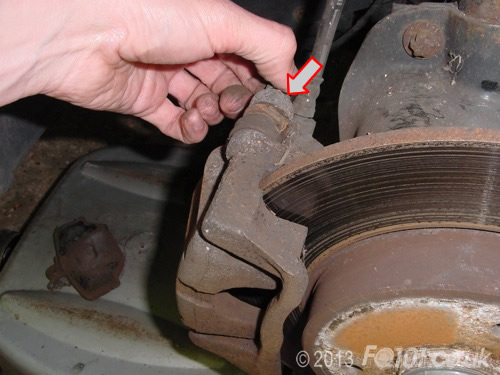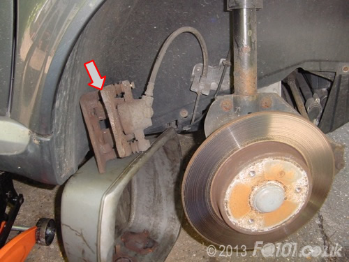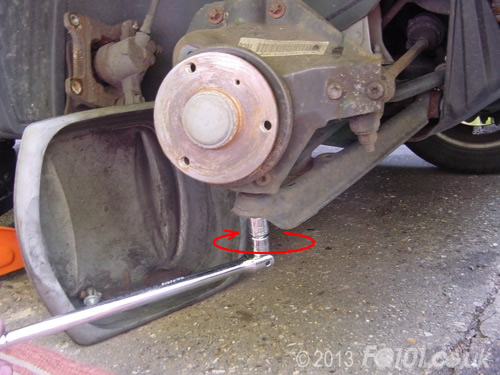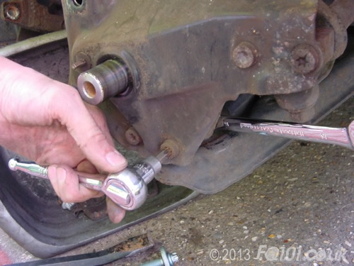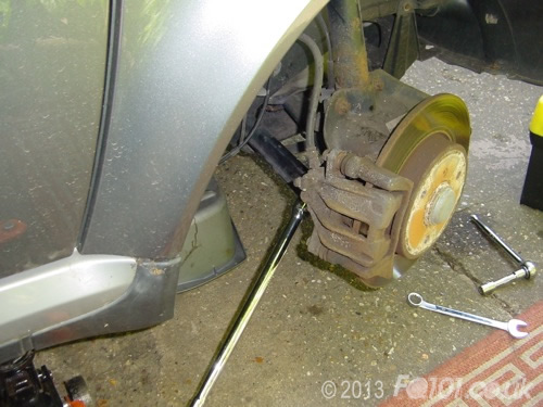 Start with the brake caliper. Use a 17mm spanner to hold the spindle whilst you use a 13mm socket to remove the retaining bolt.