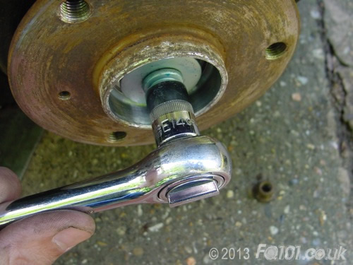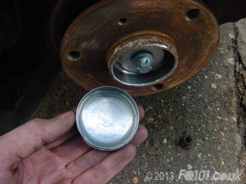 Removing the dust cap reveals the hub retaining bolt which should be replaced when you reassemble.