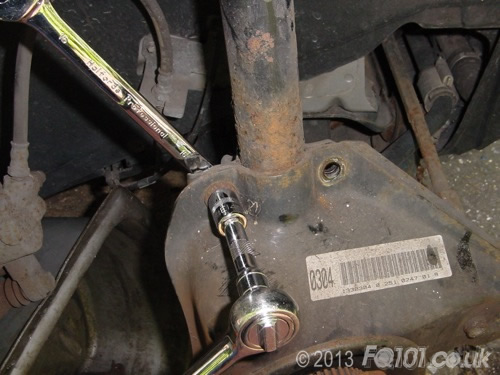 Now tighten up the retaining nut on the underside of the wishbone. To stop the shaft from rotating, we held it in place with a 4mm hex key in the end. Once the nut is tight, you can remove the hex key and correctly tighten the nut to 40Nm. There should be enough grip betwee the ball joint and the wishbone to stop it from rotating as you torque it up.