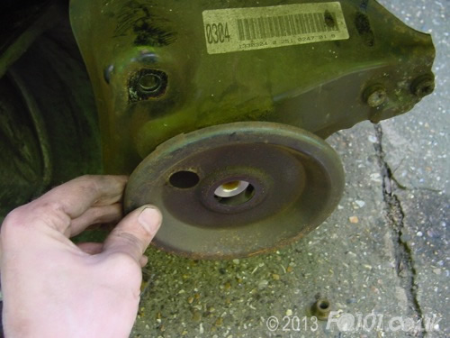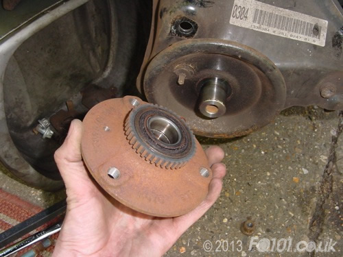 With the nut removed from the ball joint, you now need to remove the wheel hub and bearing assembly to get to the ball joint mounting bolts.