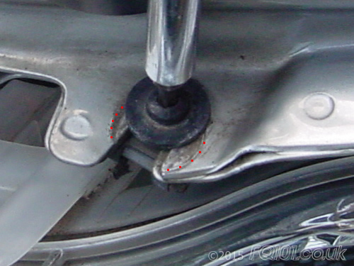 Looking closer, you can see where the screw should be. The mark in the paint is highlighted with red dots: