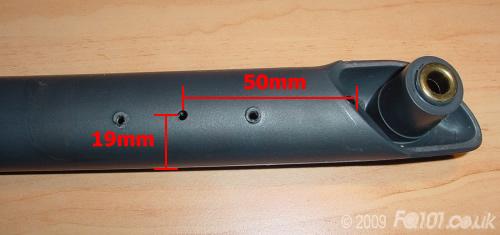 To fit the bracket to your new handle, you will need to drill a hole 3mm in diameter for the locating peg in the new handle. The dimensions are as follows. Note that the 50mm is from the edge of the chamfer and the 19mm is from the very edge of the handle exactly as shown below: