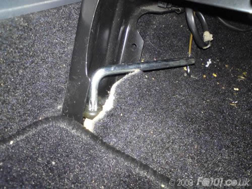 Fit bracket using the existing bolts and fold over the carpet slit to cover the bolts.