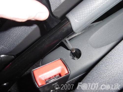 Remove the screw cover from beneath the handbrake. Be careful not to chew up the plastic. A thin, flat-blade screwdriver works well.