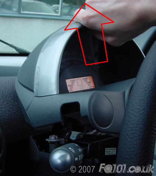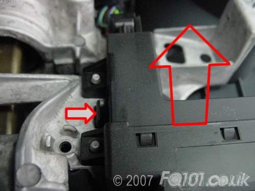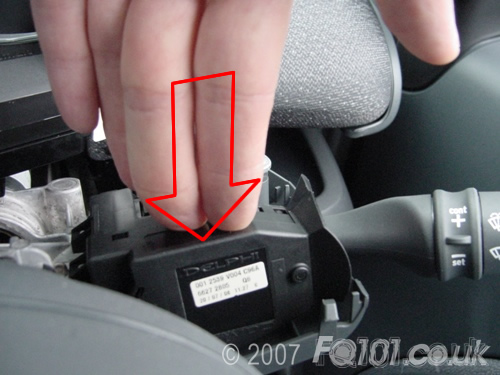 Move the speedo back out of the way. You can disconnect it if it makes it any easier to work. To remove the wiper stalk from the car, push the retaining clip in - you will hear it click. Pull the stalk upwards until it is free. You may need to gently persuade it with a screwdriver.