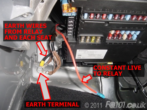 We used the ground point next to the SAM to ground both seats and the relay module itself. It was easier to do this than try to get access to the ones in the footwells. The constant live was brought out to the expansion slots on the left of the SAM and fitted with a standard sized female spade connector.