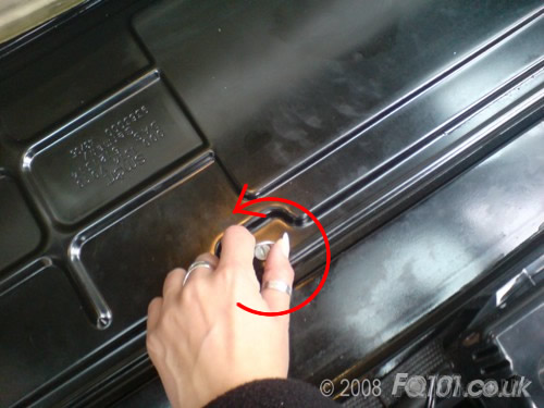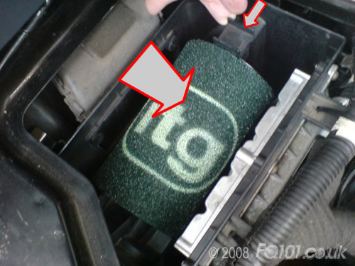 To remove the existing filter, slide the retaining arm back as shown below. Push the filter towards the back of the airbox and lift it free of the car.