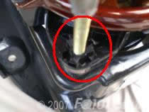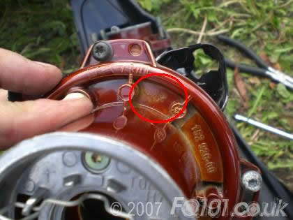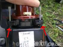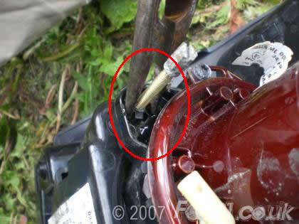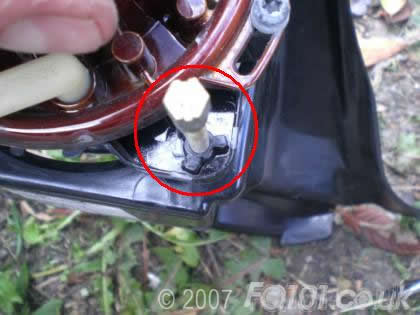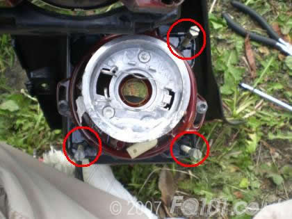Looking at the back of the housing, you can see the three adjuster screws on each lamp, at the point where the adjuster goes 'through' the lamp, it is attached with a little three-pronged catch.