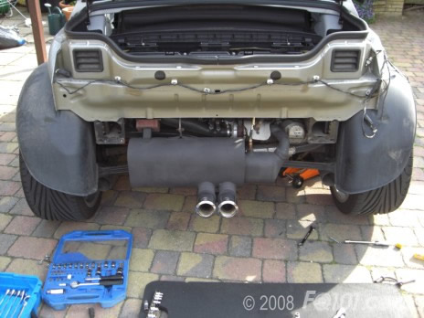 The exhaust will now come away from the car. Offer the new exhaust upto the car in exactly the same way as the other came off and re-secure the can with the E14 bolts.