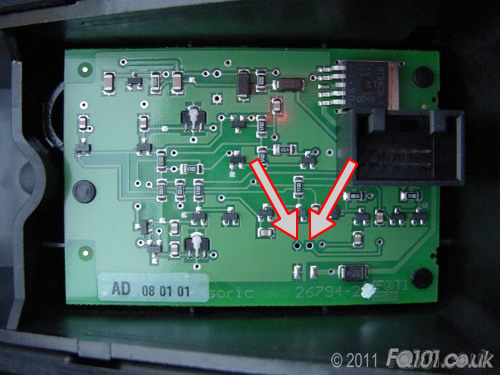 Now examine the PCB underneath. The softouch function is activated by momentarily shorting the following two terminals. To be absolutely clear, these are the ones with the larger holes in the middle (not the smaller one to the right).