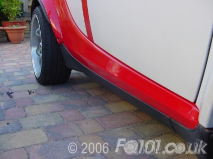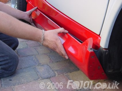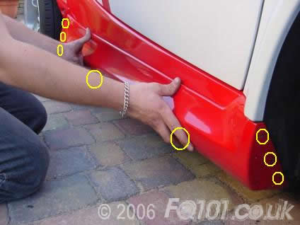 Using self tapping screws fix the skirt to the car using three at the front, three on the rear and two underneath as circled below.