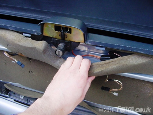 The boot panel is filled with foam sheeting. Whether this is a vain attempt at soundproofing or to stop little rattles is a subject open to debate! Start to remove the foam to reveal the wiring. You will need to remove the upper section and the main centre section to gain full access.