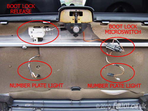 You will probably have disconnected the numberplate lights when you removed the back panel. So all that is left is the boot release solenoid and lock microswitch. Both of these have small retaining clips which need to be moved before the connector will come apart.