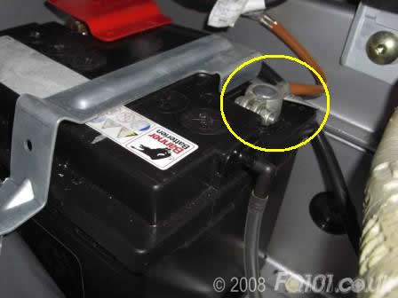 Using a 10mm socket/spanner, remove the negative terminal and the holding bracket. This bracket holds the battery in place. If your new battery is not tall enough then it will slide around within the battery bay.