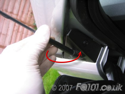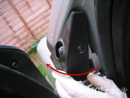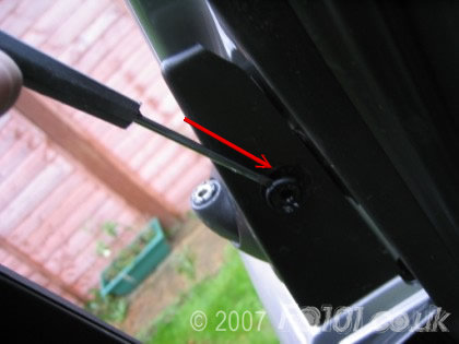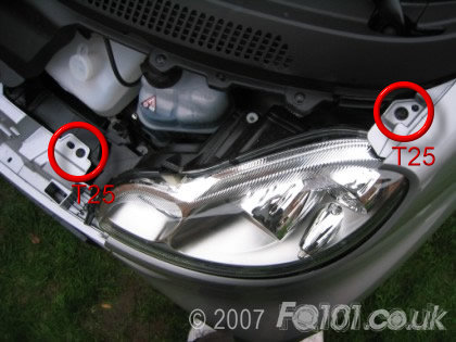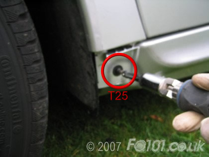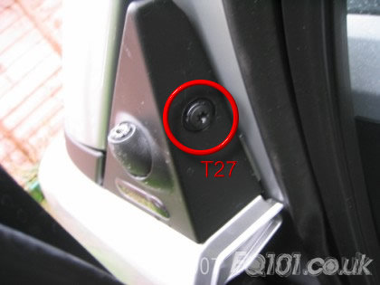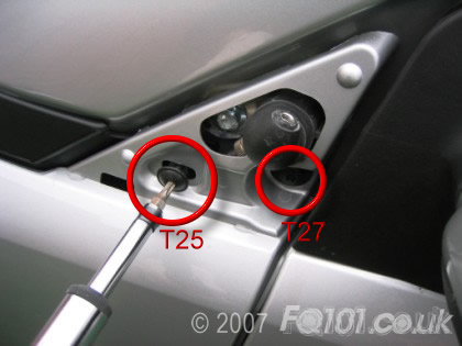 Underneath the triangle you need to remove the T25 and the T27 screws shown (repeat both sides of the car).