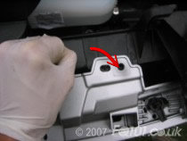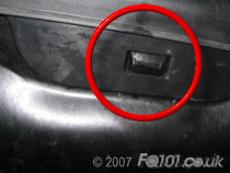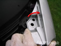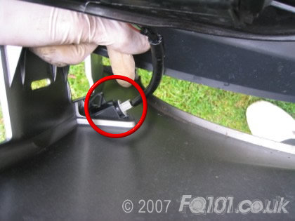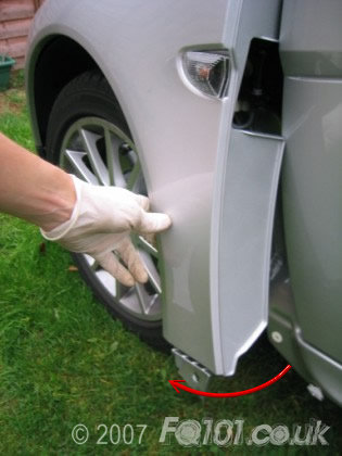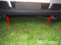 Underneath the front spoiler are two clips which attach the panel to the undertray. Reach under and unclip them.