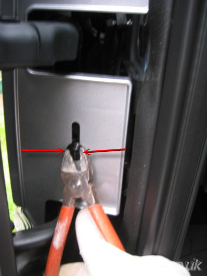 With the door still open, remove the single plastic rivet pin using pliers (or similar).
