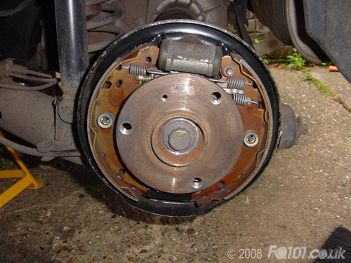 Release the handbrake and try to pull the drum free. It will probably be stuck so tap it all around the edge with a hammer to break the rust.